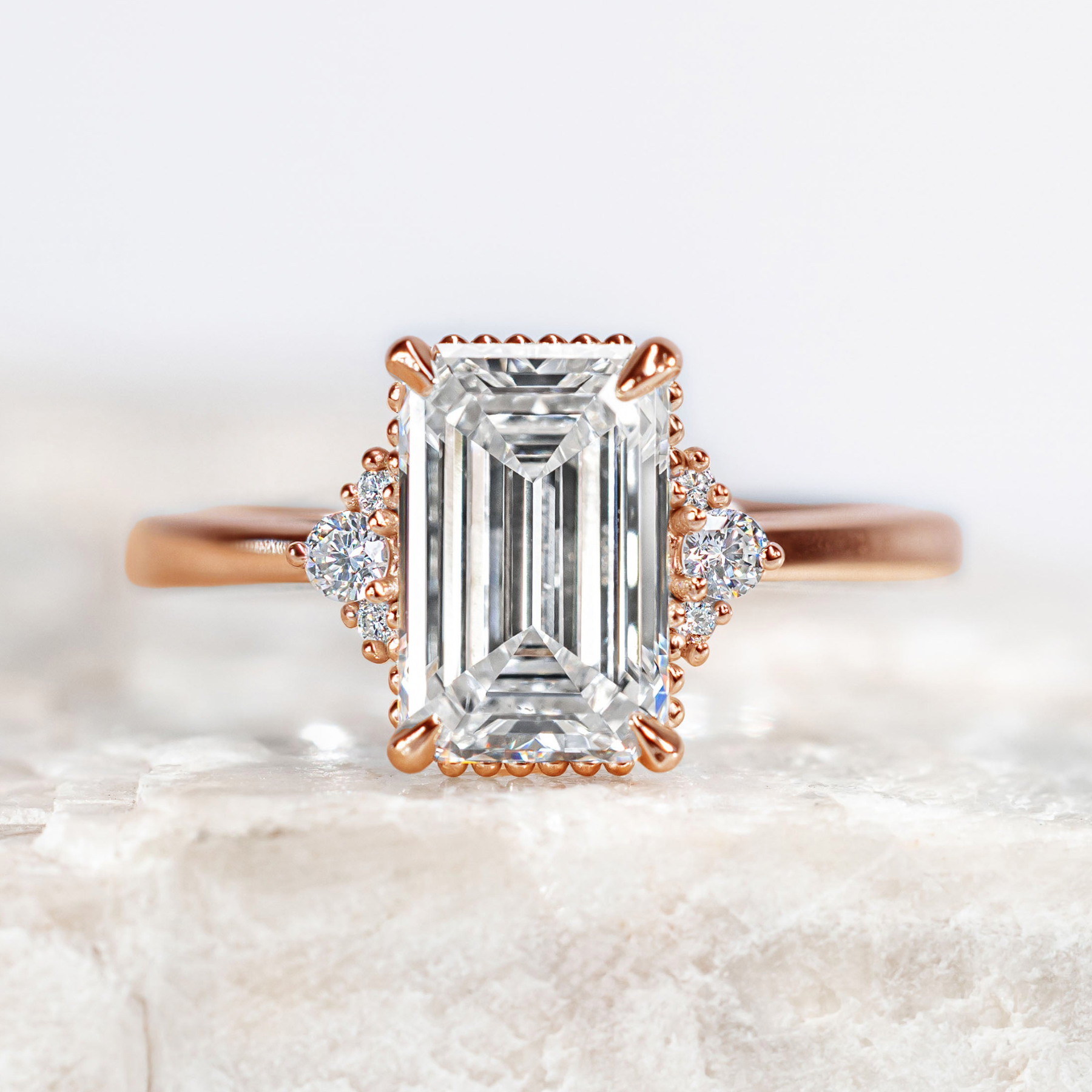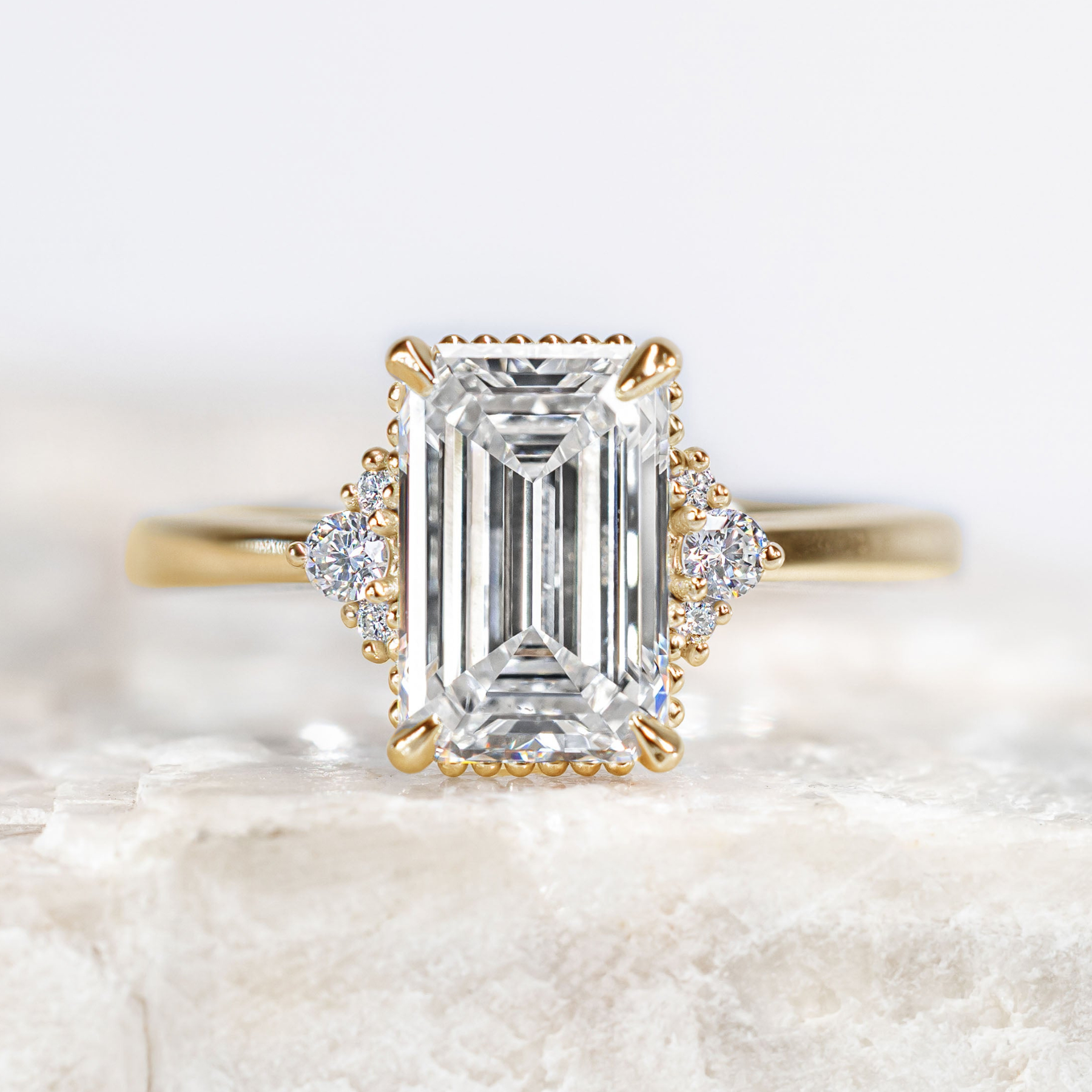 Mayfair is all about the vintage details, featuring a delicate cluster of three ethically sourced diamonds and subtle beading beneath the center stone for a touch of antique charm. Dainty and low-profile, this refined design often pairs effortlessly with wedding bands for a smooth, gap-free stack. Timeless and understated, Mayfair brings classic elegance to a beautifully compact silhouette.