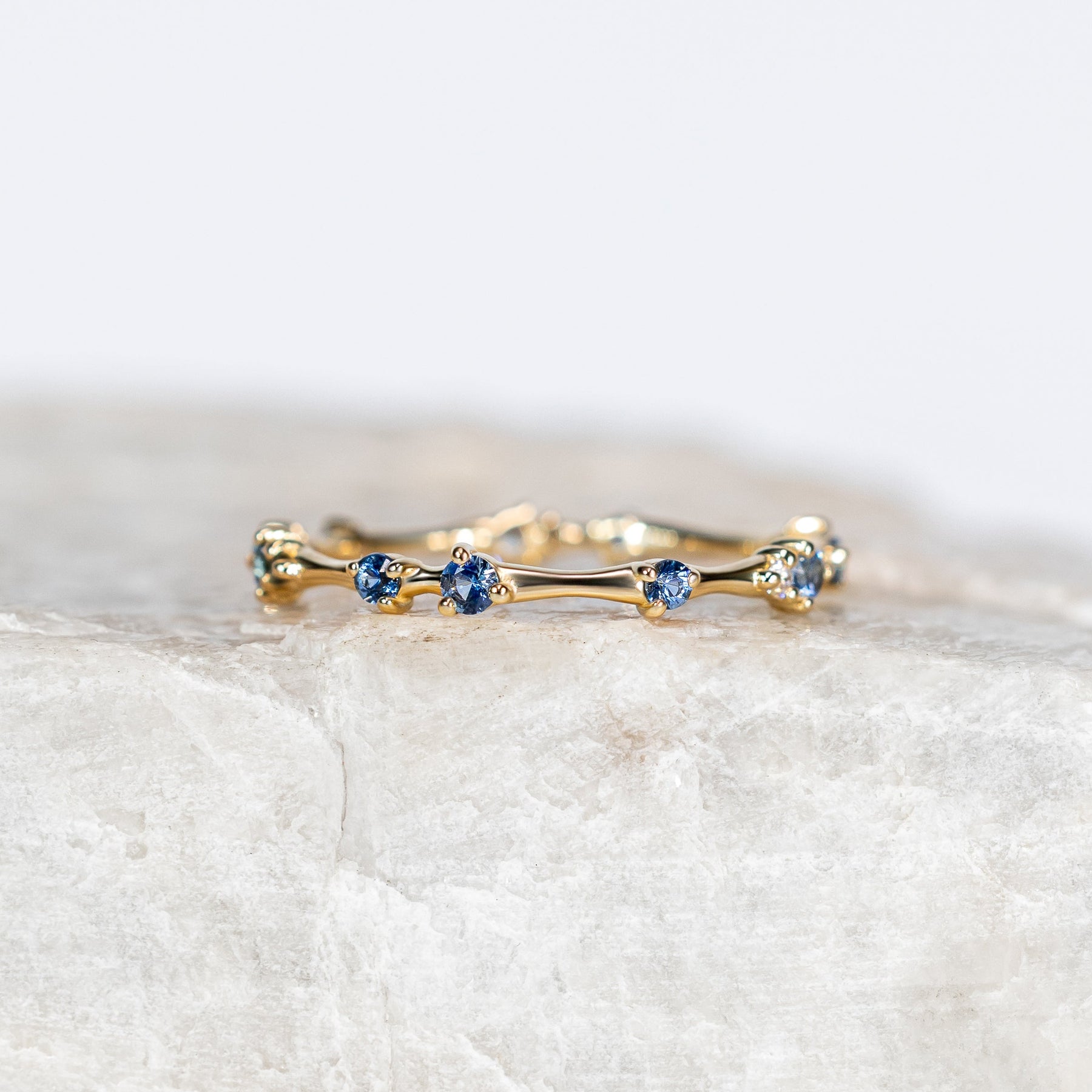 An array of sparkling denim blue sapphires accented with a couple brilliant diamonds, artfully scattered around the band in a constellation-like pattern. This one-of-a-kind piece captures the magic of a starry night sky with its mix of vibrant color and subtle sparkle. Perfect as part of your ever-growing stack or as a truly unique wedding band. Approx. 0.38 carats