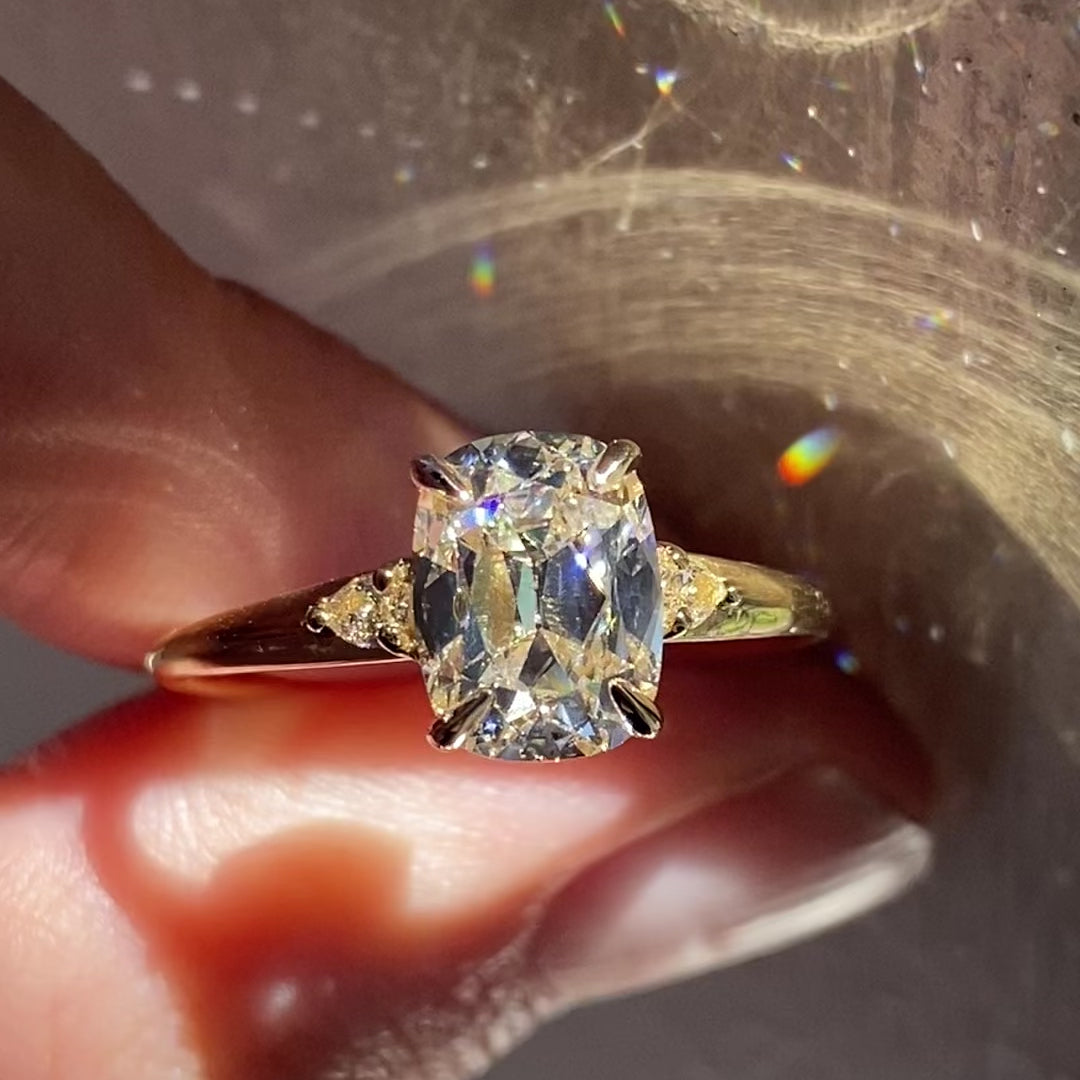 Lulu is a vintage-inspired three-stone engagement ring with a wide, tapering band and delicate inlaid pear-cut diamond side stones that frame your center stone with soft sparkle. Claw prongs and a clean silhouette add refined detail, while the low-profile design ensures comfortable, everyday wear and effortless stacking with wedding bands.