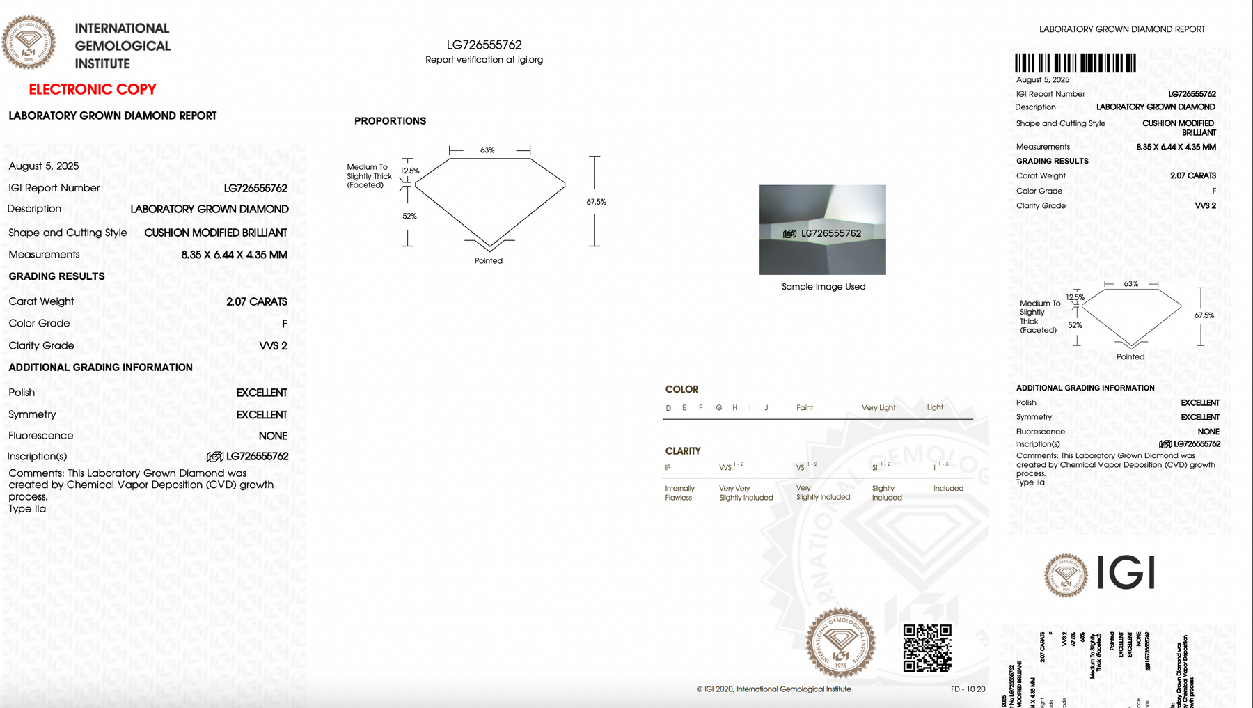 This center stone selected by our diamond specialists is an Elongated Cushion Cut Lab Grown Diamond (CVD), 2.07ct F VVS2 Very Good Cut, Excellent Symmetry/Polish. Dimensions: 8.35 x 6.44 x 4.35mmmm. (Ratio: 1.30) The IGI certificate number is LG726555762