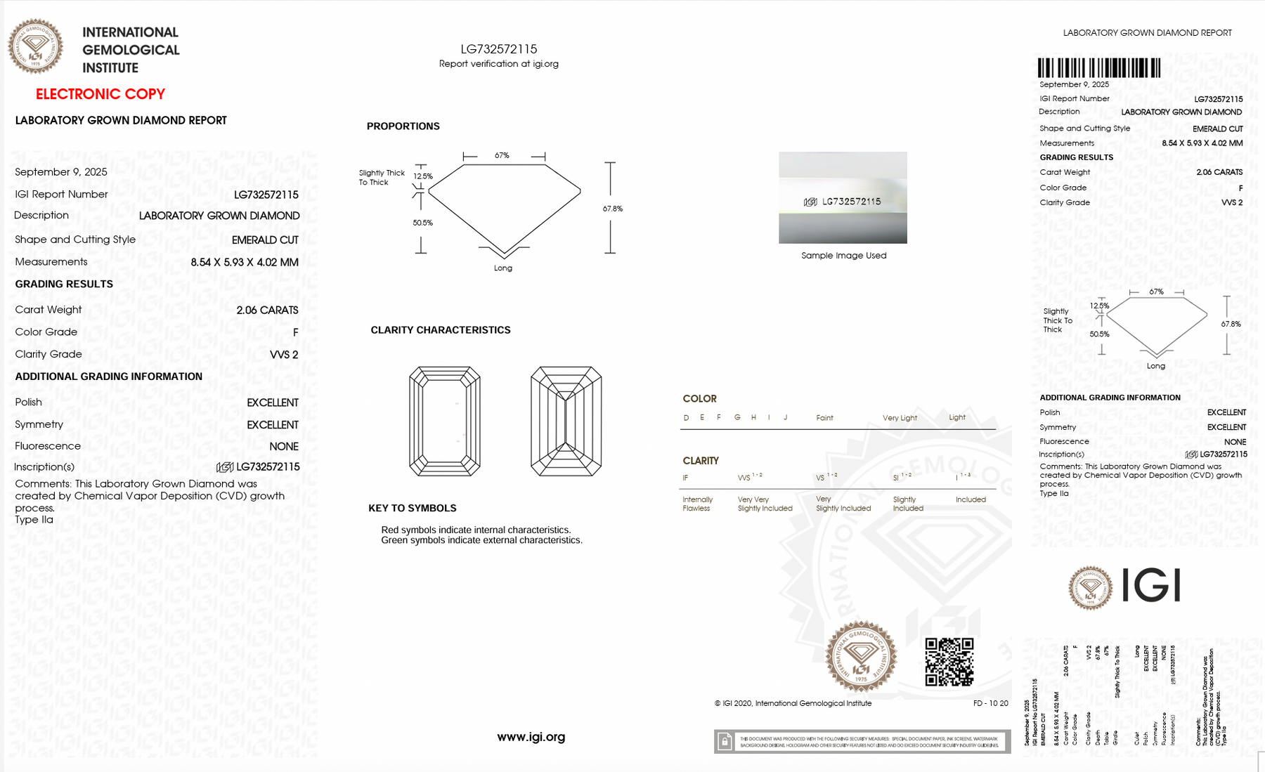 This center stone selected by our diamond specialists is an Emerald Cut Lab Grown Diamond (CVD), 2.06ct. F VVS2, Excellent Cut, Excellent Symmetry/Polish. Dimensions:8.54 x 5.93 x 4.02 mm. (Ratio: 1.44) The IGI certificate number is LG732572115