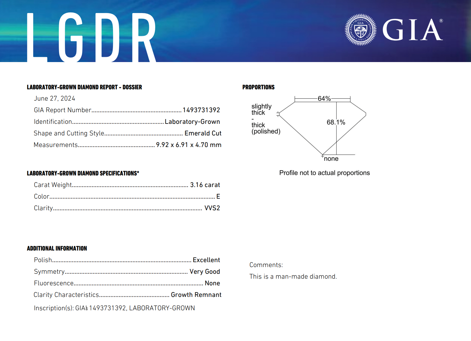 This center stone selected by our diamond specialists is an Emerald Cut Lab Grown Diamond (HPHT), 3.16ct S VVS2 Excellent Cut, Excellent Symmetry/Polish. Dimensions: 9.92 x 6.91 x 4.70mm. (Ratio 1.44). The GIA certificate number is 1493731392