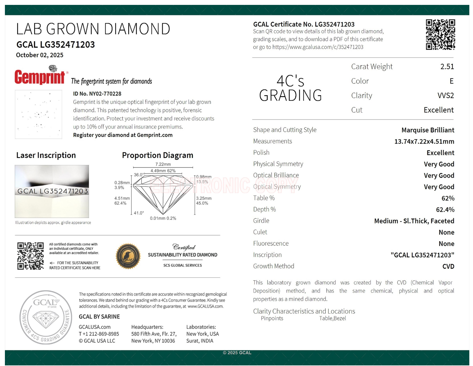 This center stone selected by our diamond specialists is a Marquise Cut Lab Grown Diamond (CVD), 2.51ct E VVS2 Excellent Cut, Excellent Symmetry/Polish. Dimensions: 13.74 x 7.22 x 4.51mm. (Ratio: 1.90) The GCAL certificate number is LG352471203