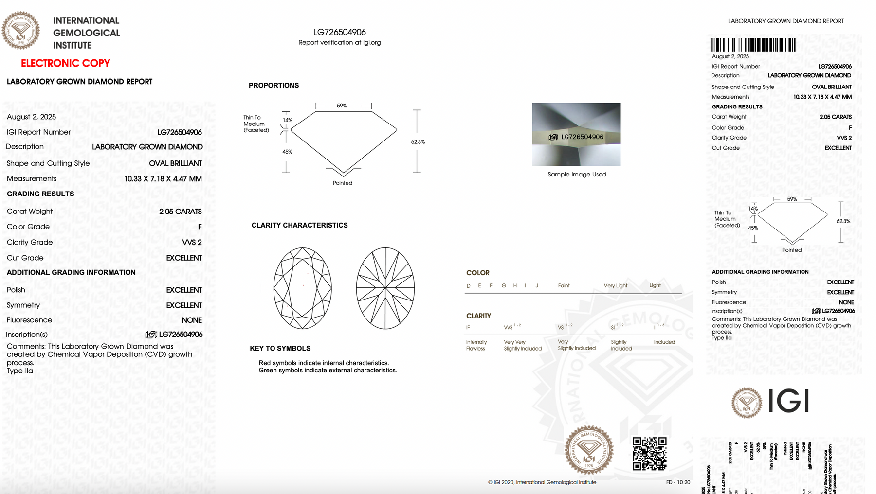 This center stone selected by our diamond specialists is an Oval Cut Lab Grown Diamond (CVD), 2.05ct. F VVS2, Excellent Cut, Excellent Symmetry/Polish. Dimensions: 10.33 x 7.18 x 4.47mm. (Ratio: 1.44) The IGI certificate number is LG726504906