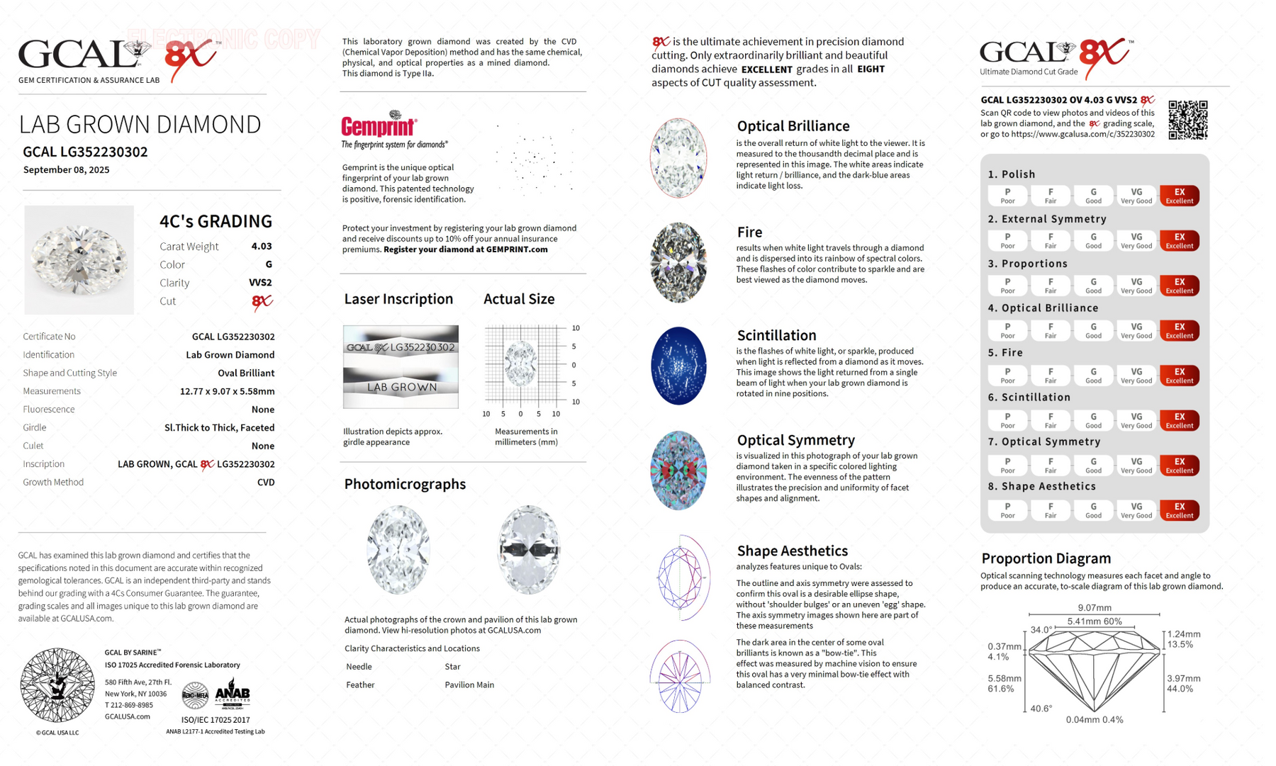 This center stone selected by our diamond specialists is an Oval Cut Lab Grown Diamond (CVD), 4.03ct. G VVS2, 8X Cut, Excellent Symmetry/Polish. Dimensions: 12.77 x 9.07 x 5.58mm. (Ratio: 1.41) The GCAL certificate number is LG352230302