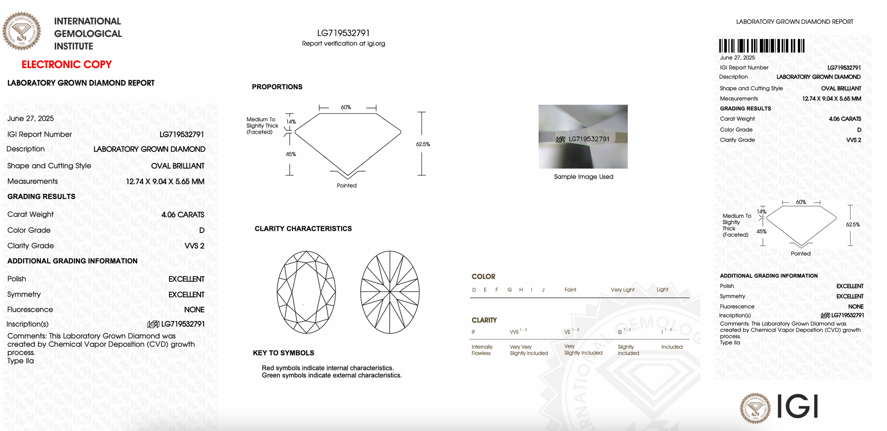 This center stone selected by our diamond specialists is an Oval Cut Lab Grown Diamond (CVD), 4.06ct. D VVS2, Excellent Cut, Excellent Symmetry/Polish. Dimensions: 12.74 x 9.04 x 5.65mm. (Ratio: 1.41) The IGI certificate number is LG719532791
