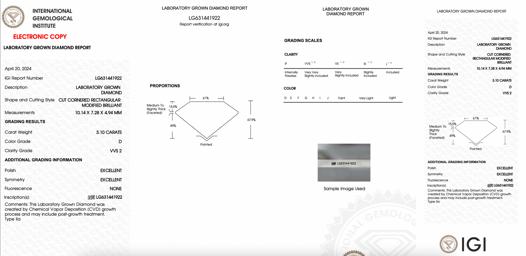 This center stone selected by our diamond specialists is a Radiant Cut Lab Grown Diamond (CVD), 3.10ct D VVS2 Excellent Cut, Excellent Symmetry/Polish. Dimensions:10.14 x 7.28 x 4.94 mm. (Ratio 1.39). The IGI certificate number is LG631441922