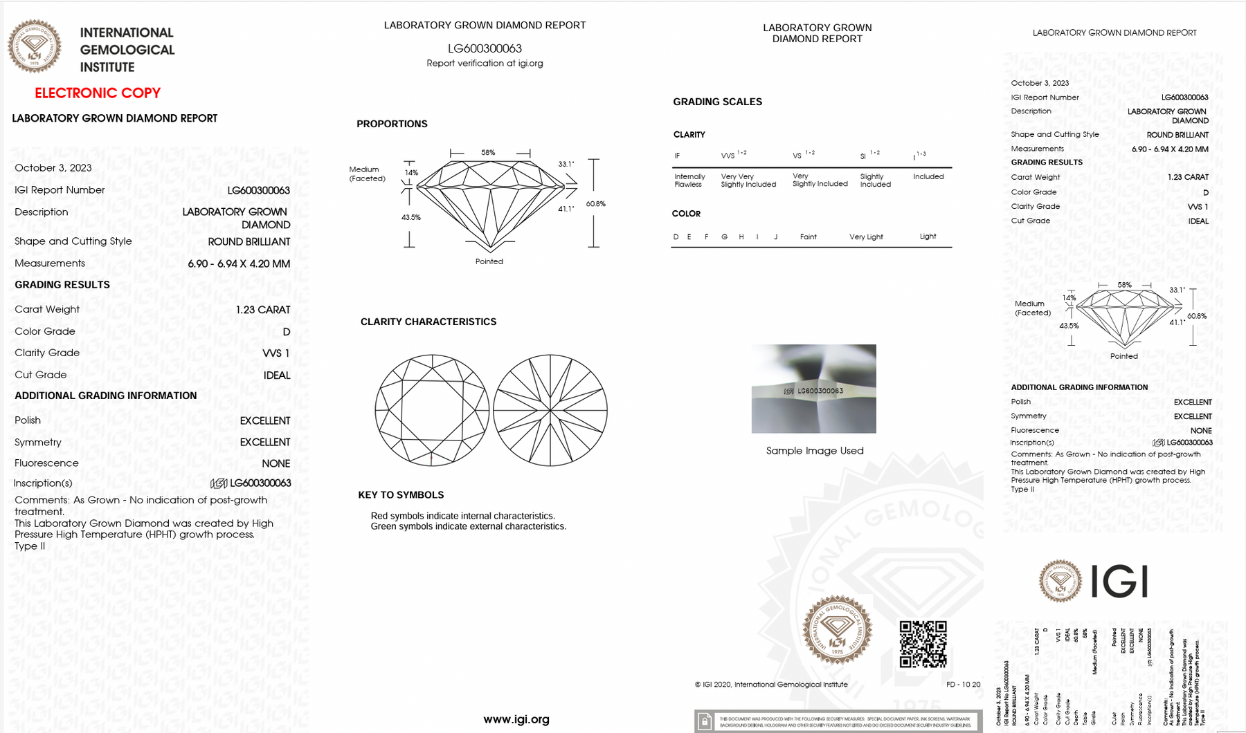 This center stone selected by our diamond specialists is a Round Brilliant Cut Lab Grown Diamond (HPHT), 1.23ct D VVS1 Ideal Cut, Excellent Symmetry/Polish. Dimensions:6.90 - 6.94 x 4.20mm. The IGI certificate number is LG600300063