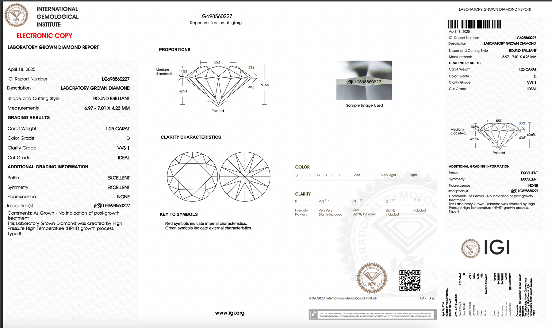This center stone selected by our diamond specialists is a Round Brilliant Cut Lab Grown Diamond (HPHT), 1.25ct D VVS1 Ideal Cut, Excellent Symmetry/Polish. Dimensions:6.97 - 7.01 x 4.23mm. The IGI certificate number is LG698560227