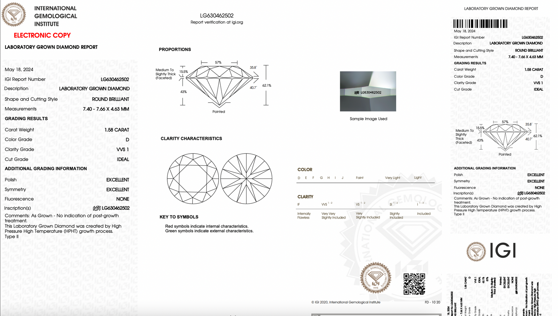 This center stone selected by our diamond specialists is a Round Brilliant Cut Lab Grown Diamond (HPHT), 1.58ct D VVS1 Ideal Cut, Excellent Symmetry/Polish. Dimensions: 7.40-7.66 x 4.63mm. The IGI certificate number is LG630462502
