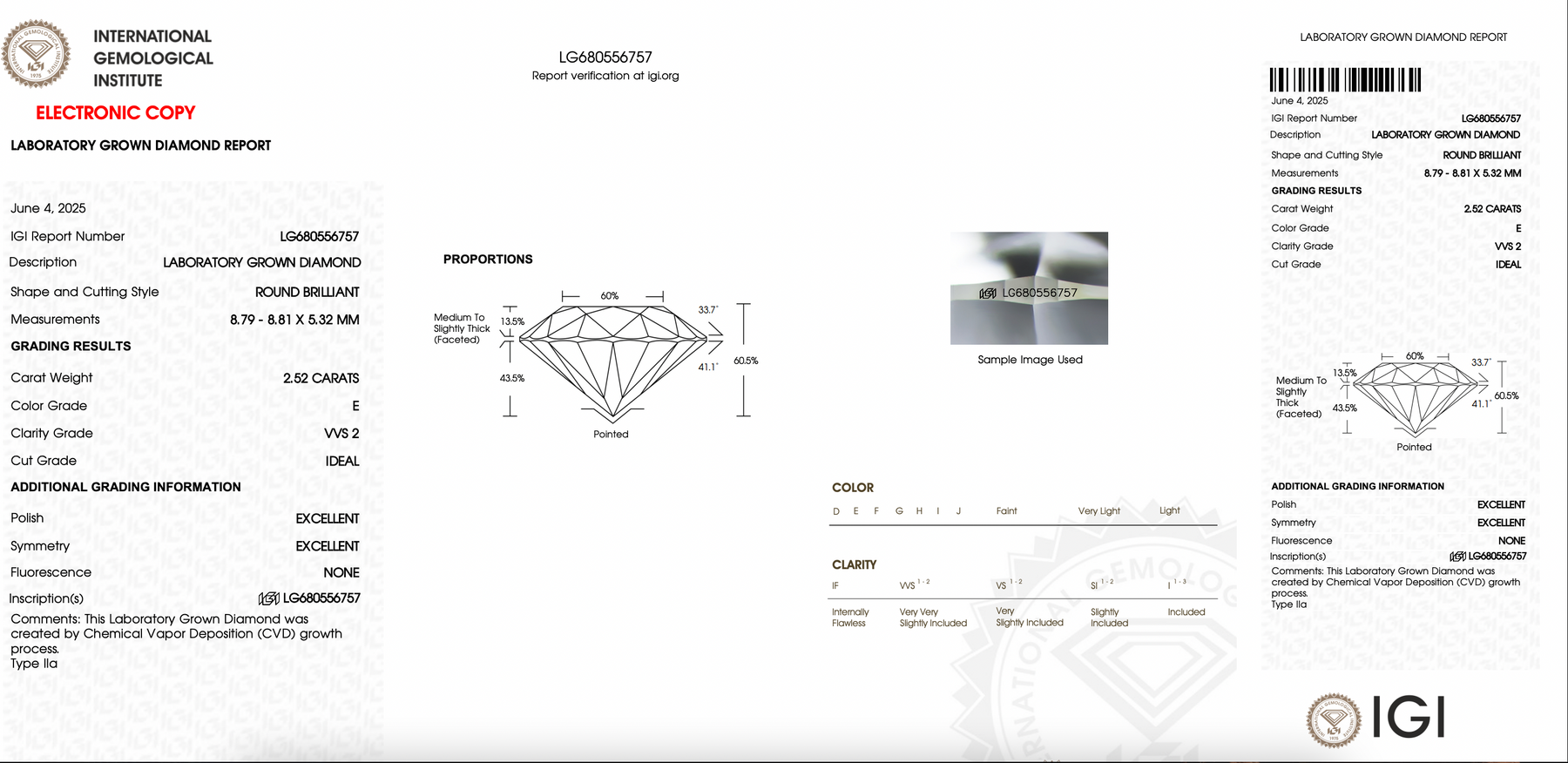 This center stone selected by our diamond specialists is a Round Brilliant Cut Lab Grown Diamond (CVD), 2.52ct E VVS2 Ideal Cut, Excellent Symmetry/Polish. Dimensions: 8.79 - 8.81 X 5.32 mm. The IGI certificate number is LG680556757