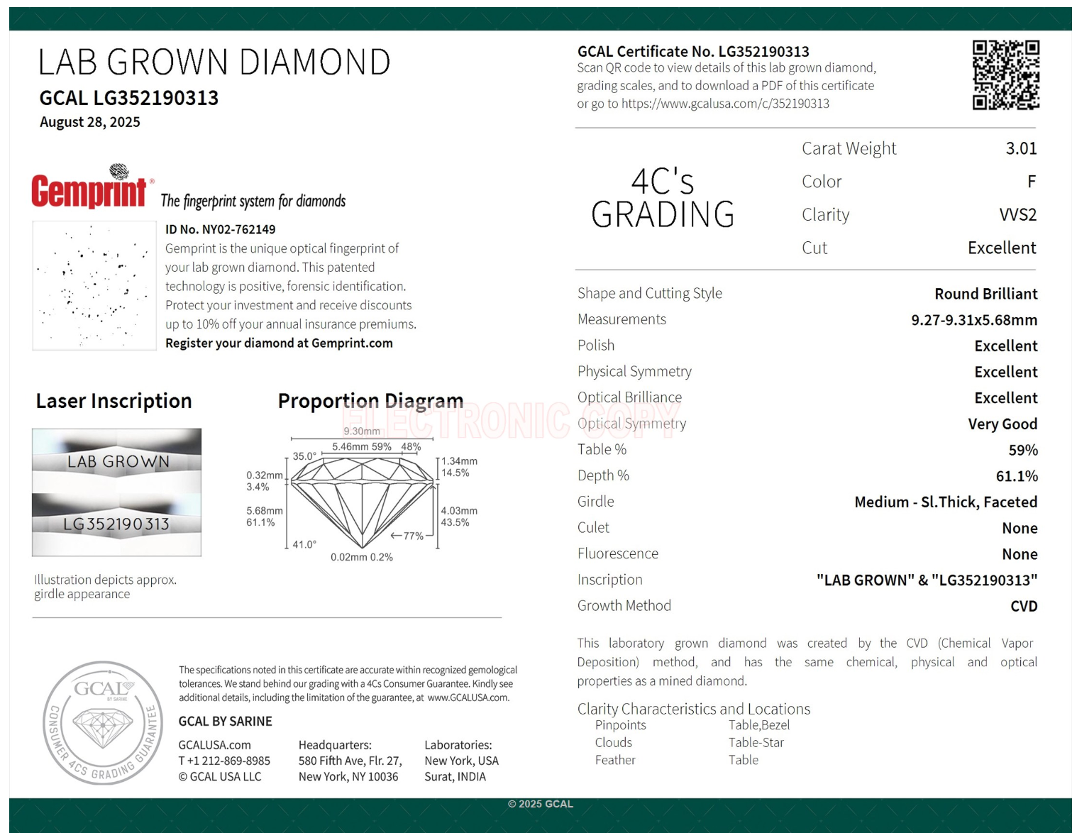 This center stone selected by our diamond specialists is a Round Brilliant Cut Lab Grown Diamond (CVD), 3.01ct F VVS2 Excellent Cut, Excellent Symmetry/Polish. Dimensions: 9.27 - 9.31 x 5.68mm. The GCAL certificate number is LG352190313