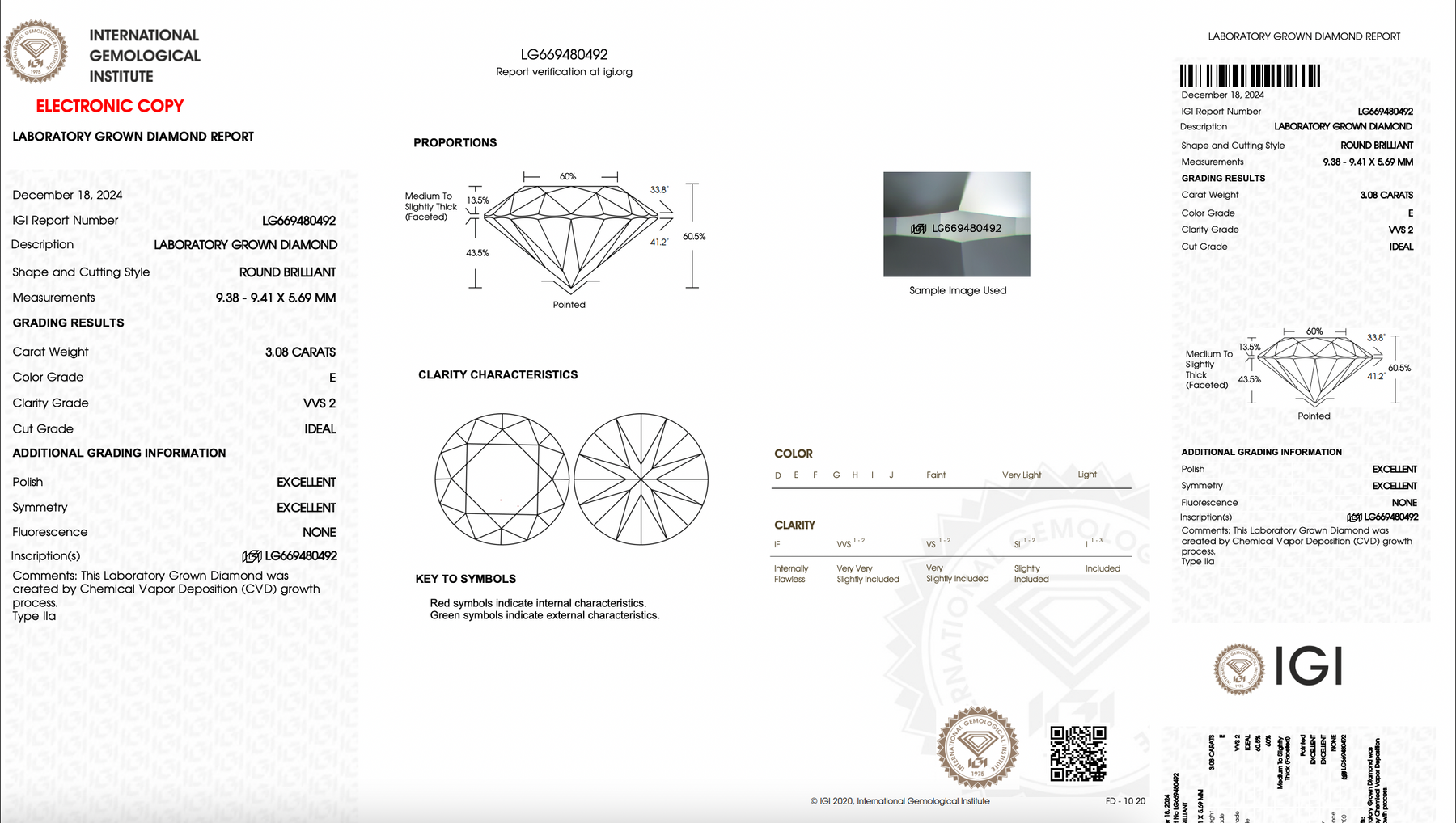 This center stone selected by our diamond specialists is a Round Brilliant Cut Lab Grown Diamond (CVD), 3.08ct E VVS2 Ideal Cut, Excellent Symmetry/Polish. Dimensions: 9.38-9.41 x 5.69mm. The IGI certificate number is LG669480492