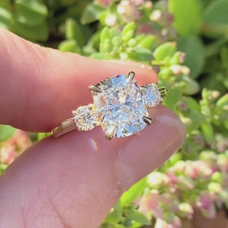 The Abigail is a timeless three-stone engagement ring with a refined modern edge, featuring two brilliant-cut diamond side stones that beautifully frame and enhance the center stone. Designed for perfect balance, this setting offers symmetry, sparkle, and a graceful silhouette. With its tapered band and low-profile cathedral setting, the Abigail sits comfortably on the hand and pairs effortlessly with a wedding band for a seamless, stacked look.