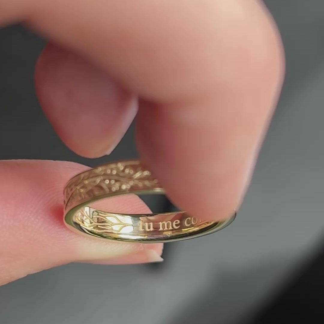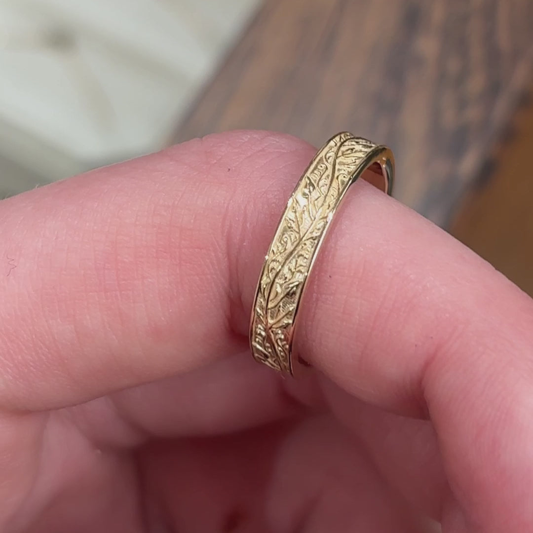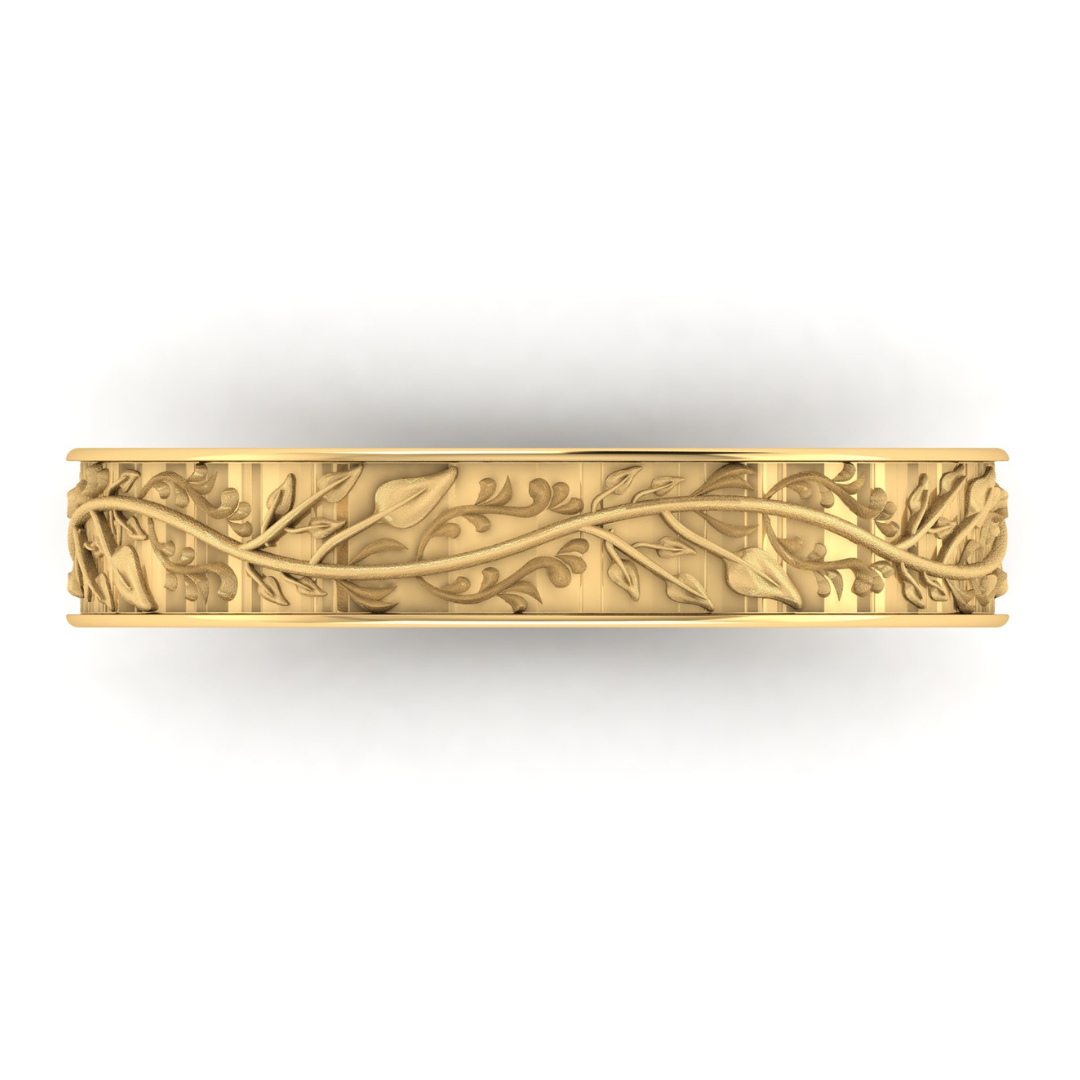 A custom band with a raised leaf and vine motif and custom engraving in the interior.
