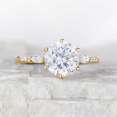 Georgette is a vintage-inspired engagement ring featuring a graceful arrangement of marquise and round brilliant ethically sourced diamonds that frame your center stone with soft sparkle. The low-profile setting offers both comfort and elegance, allowing a wedding band to sit flush for a seamless, stacked look. With its timeless charm and delicate detailing, Georgette is a uniquely graceful design rooted in vintage romance.