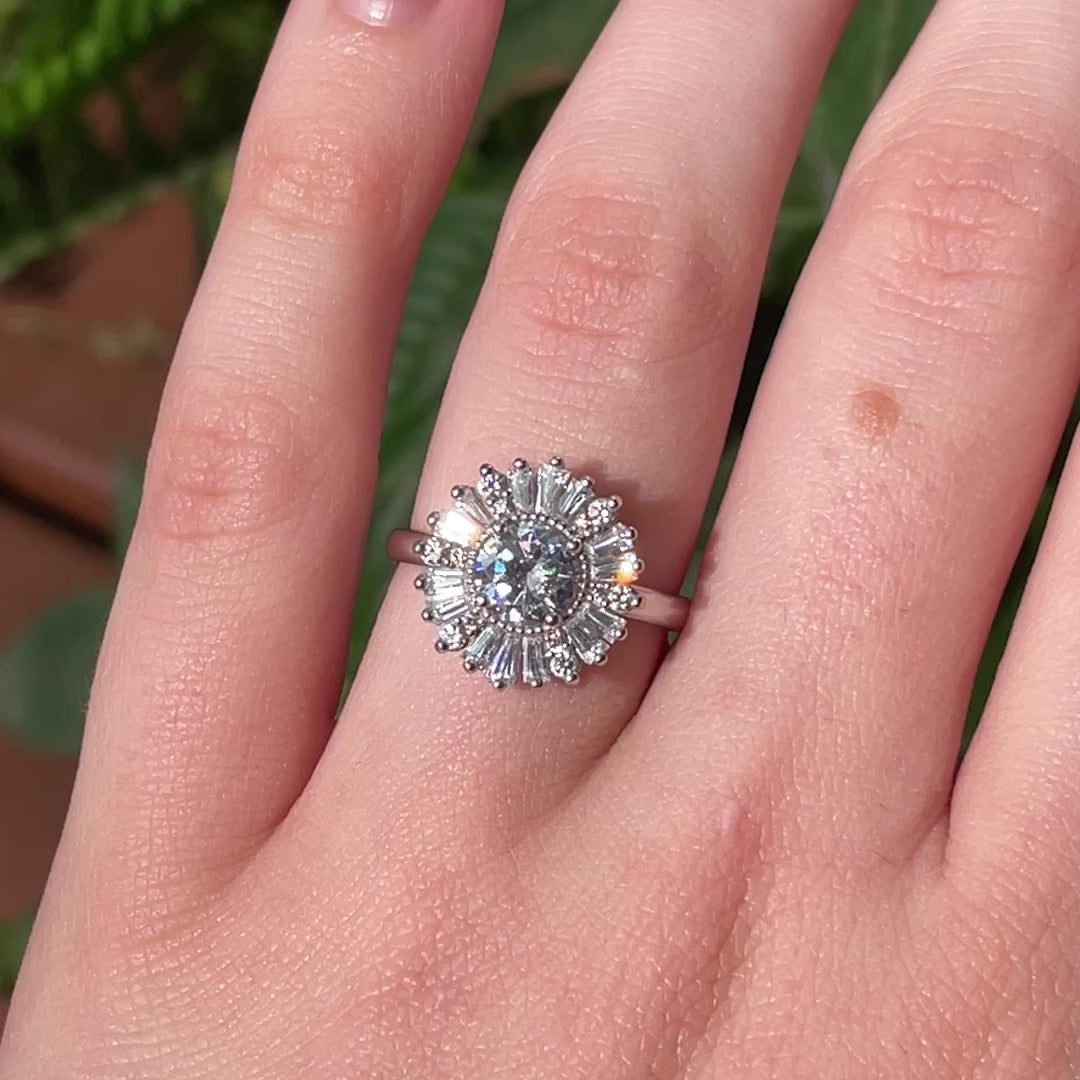 Jenny is a vintage-inspired engagement ring that blends the elegance of 1940s Ballerina rings with the delicate sparkle of a snowflake. A symmetrical halo of tapered baguette diamonds surrounds a round center stone, creating movement and brilliance from every angle. This low-profile design allows a wedding band to sit flush for a seamless, stacked look - timeless, refined, and full of charm.