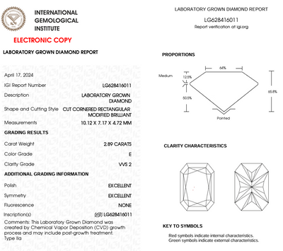 This center stone selected by our diamond specialists is an Radiant Cut Lab Grown Diamond (CVD), 2.89ct E VVS2, Excellent Symmetry/Polish. Dimensions: 10.12 x 7.17 x 4.72mm. (Ratio: 1.41) The IGI certificate number is LG628416011